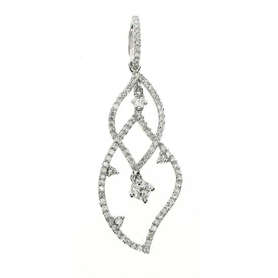 This is a 18K white gold diamond pendant jewellery. The diamond pendant is in an organic design in the shape of leaves. All the metal curves in the pattern are decorated with bead set diamonds. There are two bigger diamond stones set on two of the ends of the leaves.