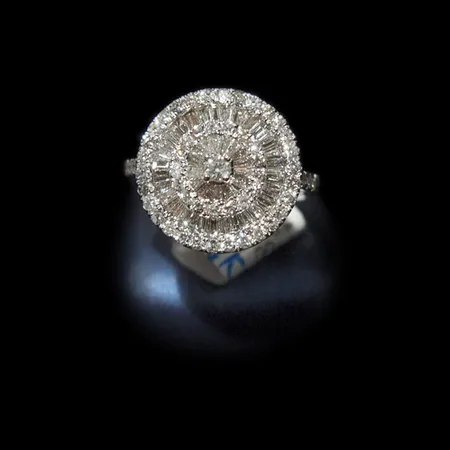 This gorgeous ring turns head with an extravagant design crafted on an 18K white gold setting. The round-shaped centerpiece is adorned by sparkling diamonds for extra brilliance. This breathtaking 18K white gold diamond ring is the one for making a perfect proposal.