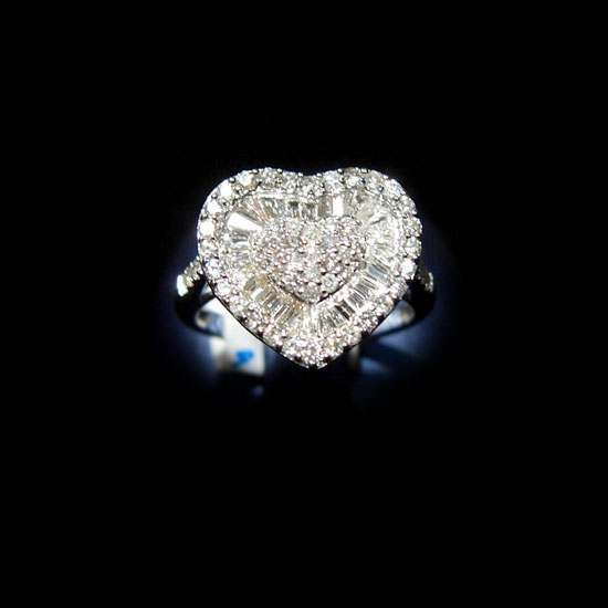 This dazzling ladies' ring captures your eyes with a romantic heart-shaped design. The 18K white gold setting strives for perfection with twinkling diamonds, which are crafted meticulously for a radiant glow. This passionate 18K white gold diamond ring is the one for making a perfect proposal.