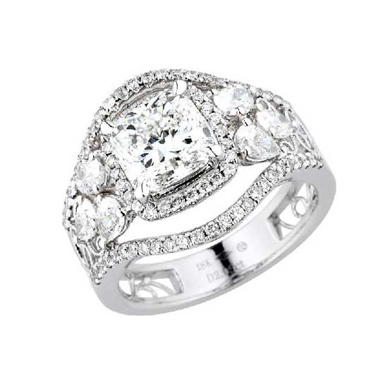 This is an 18K white gold ring featuring a big glaring diamond in the center and also multiple small ones for an alluring touch. The delicate cutouts on the band add spice to the design easily. This beautiful diamond ring is an ideal gift for your wife or girlfriend.