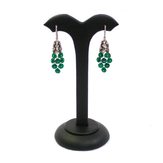 Pictured is a pair of dainty earrings made of 18K white gold and jade. The dainty grape design adds a graceful touch. The dazzling colored diamond accents offer added elegance and brilliance.