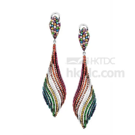 Let the rainbow dance on your ears with these chandelier earrings that sends out a happy vibe. Featuring a stud made of colourful beads, each earring spreads into rainbow-like tassels assembled by tsavorites, blue diamonds, pink and orange sapphires.