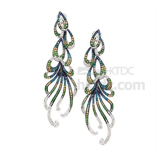Compliment your outfit with this pair of refined earrings that draws inspirations from rain. The upper part of each earring features several pear-shaped raindrops, dripping into sparkling ripples. With the delightful combination of tsavorites, blue sapphires, green, blue and white diamonds, this pair is a wonderful mood lifter.