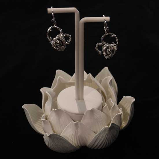 Showcased is a pair of handmade 18K white gold earrings. It features a floral-shaped design with a diamond setting. These exquisite white gold earrings are excellent jewelry items to adorn your evening outfit.