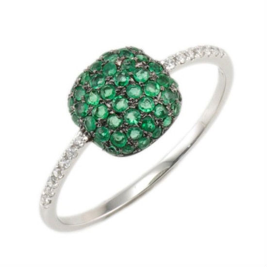 This cushion-theme ring's band is crafted with 18K white gold. The cushion is assembled with diamonds and emeralds. This ring simply delights with feminine yet youthful appearance.