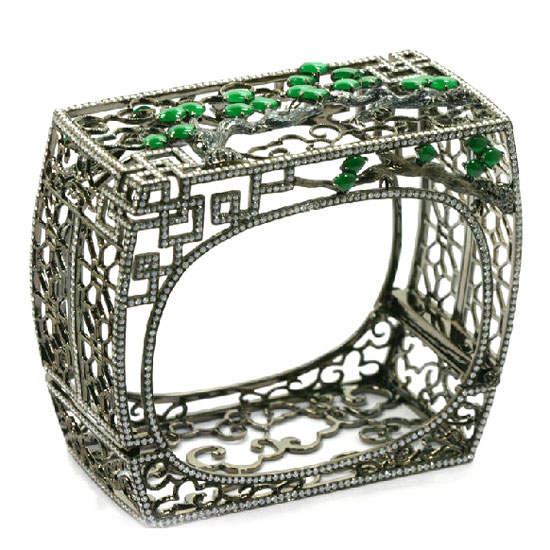 This is an elegant bangle that comes with an 18-karat white gold structure. The allover dazzling diamonds add a touch of style to the whole piece. This exquisite bangle is accented with natural green jade stones for a touch of uniqueness.
