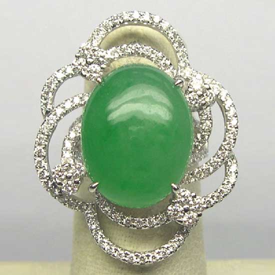 This is a dazzling finger ring that is made of 18-karat white gold. It is accented with a large oval-shaped green jade for a sense of luxuriousness. The floral-inspired setting is paved with small white dazzling diamonds.