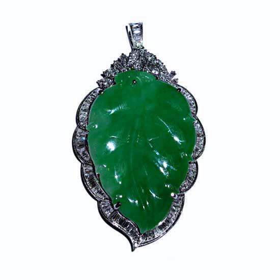 This pendant features a simple and elegant design. It is made of jade and 18K white gold. The jadeite part is polished and shaped into a size of a leaf. It is a complementary item for your daily or formal outfits.