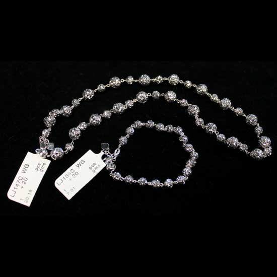 The ladies' jewelry set includes a necklace and a bracelet made of 18K white gold. Each item features a chain of beads carved with veiled pattern. The beads are spaced at regular intervals, with the bigger beads followed by the smaller ones. The antique style makes the accessories extremely dashing to wear.