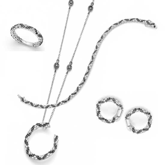 This set of jewelry plays with the color contrast of black and white. The set includes a ring, a necklace, a bracelet and a pair of earrings. All are made with black and white diamonds in a twisting manner. The set gives off modern elegance through the simple design and bold use of colors.