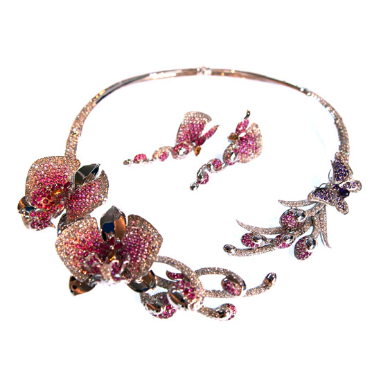 This stunning 18K white-gold jewelry set shows off a captivating orchid design, revealing exquisite craftsmanship. The lifelike butterfly accents remind you of the beautiful spring. This shimmering jewelry set is sure a masterpiece to your jewelry collection.