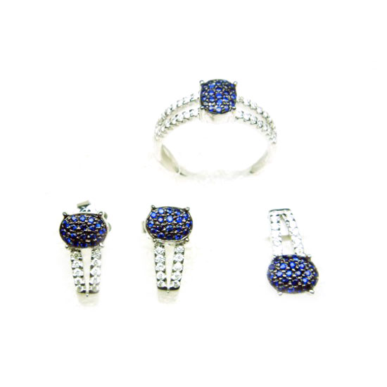 This is a jewelry set that includes a pair of earrings, a pendant and a finger ring. The allover dazzling diamonds and sapphire gemstones add a touch of elegance to each piece. The 18-karat white gold structure shimmers with a high-gloss finish.