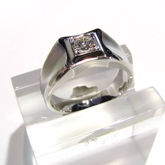This is a 18K white gold diamond ring for men. There is a diamond centerpiece in bezel setting, surrounding by a square frame. The ring shoulders are wavy in pattern and brings out simplicity and nobility to the wearers.