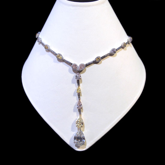 The 18K white gold necklace is finished with intricate and luxurious details. It is embellished with huge diamonds in assorted captivating colors. This stunning necklace is your fail-safe accessory for cocktail parties, receptions, etc.