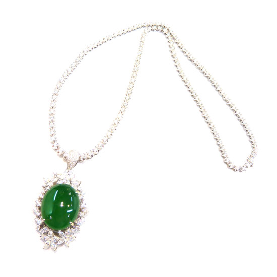 This 18K white gold necklace shimmers with a high-gloss finish. The large oval-cut jadeite gemstone is surrounded by dazzling loose diamonds. This fashionable jewelry pairs with your outfit nicely.