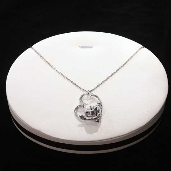 The 18k white gold pendant features a darling heart-shaped construction. It showcases a rose-shaped accent with diamond inlay to give a sparkling touch. This brilliant pendant makes a great addition to your jewelry collection.