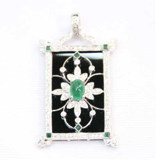 The 18K white gold pendant is set with sparkling diamonds and emeralds. The black onyx adds a touch of modernity. Highlight your look with this 18K white gold pendant.