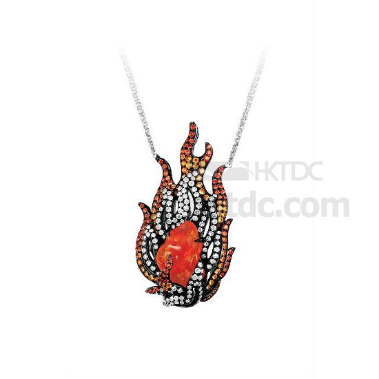 At the centre of this playful pendant lies a fire opal, which signifies energy and power, while the surroundings are paved with orange sapphires and white diamonds. This jewel is a reminder of the importance of passion to every heart and soul.