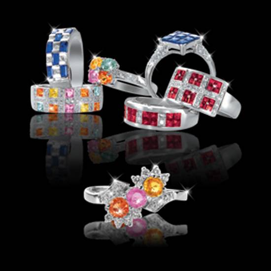 These are 18K white gold rings with different precious stones and diamonds. The gemstones include rubies, blue sapphires and other coloured gemstones in different shapes and cuttings. The rings are with different settings and sizes.
