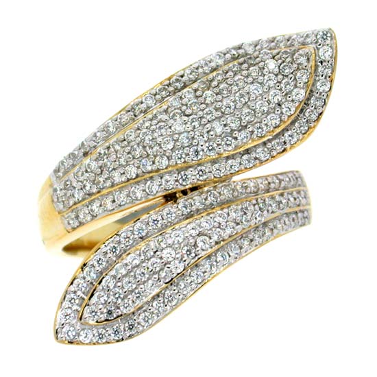 This extravagant ring features a waistband design with one end on top of another. The band boasts a polished golden finish, with both ends embedded with diamonds to give fiery brilliance. Slip on this diamond ring to invite admiring glances.