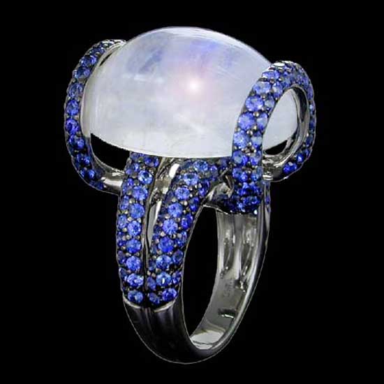 This 18K white gold ring features a coiled band shimmering with exotic sapphire stones. A moonstone cabochon proudly sits atop to give celestial shine with misty infusions. Surrender to your desires of posh elegance with this spectacular ring.