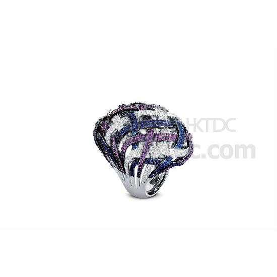 Strands of blue sapphires, amethysts and white diamonds are woven into a sparkling net sitting on top of the white-gold band. The darker colour tone adds an enigmatic charisma to the ring, making it an appealing accessory for every occasion.