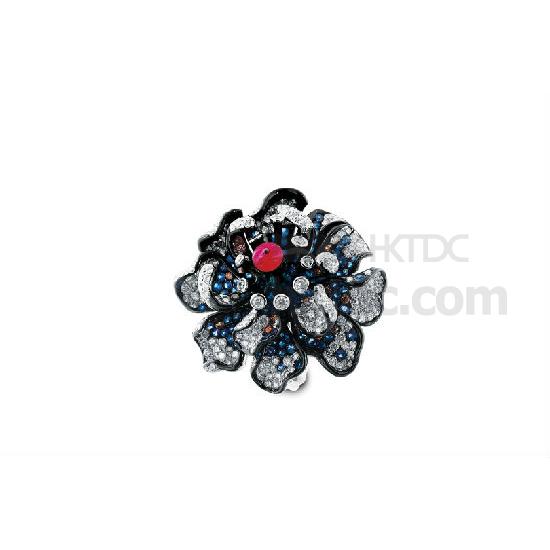 Get in the mood for love with this lustrous ring. With petals meticulously paved with sapphires and diamonds, this gem is a beautiful testimony of love. This floral ring’s unique combination of colours, as well as the centrepiece ruby, evokes a vintage feeling.