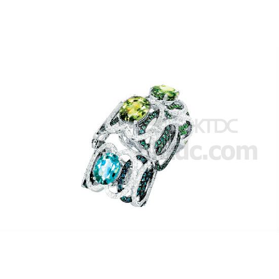 This stylish ring features a novel design: it is not a circular brand; instead, it is formed by three layers of oval rings crafted out of white and blue diamonds, with a tourmaline at the middle. As each layer is adjustable, the ring can be worn in different ways as the wearer pleases. Wrap your finger in the spinning lights radiated from this original, versatile jewel.