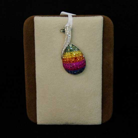 The captivating ladies' pendant flaunts a darling teardrop design in multiple colors. The fine-quality 18K white gold setting exudes a glow of elegance with perfect radiance. Exquisite craftsmanship is revealed completely by the carefully trimmed fancy diamonds and sapphire stones. Accentuate your evening dresses with this bewitching 18K white gold sapphire pendant.