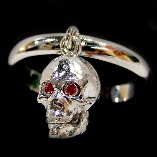 This skull ring is made of 18k white gold with hammering finish. It features a skull drop with two bezel-set round stones in red color. Plain ring shoulder have shiny finish.