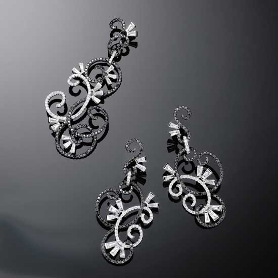 This exclusive fine jewelry set includes a pair of earrings and a pendant. The jewelry features an intricate filigree design accented with tiny black and white diamonds. Add some sparkle to your look with this stunning jewelry set.