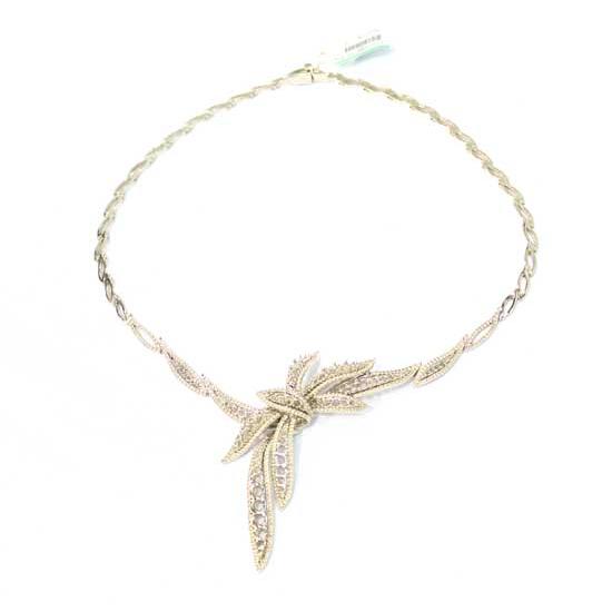 This tasteful necklace spotlights an exquisite flower-shaped pendant. Crafted of 18K white gold, the necklace is paved with twinkling white stones for added appeal. The leave-shaped chain links finish the look of this beautiful jewelry piece.