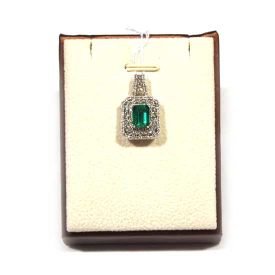 This beautiful pendant features a forest green emerald accented by shimmering tiny stones. The fancy pendant exudes irresistible shine and beauty. Add an elegant touch to your look with this gorgeous emerald pendant.