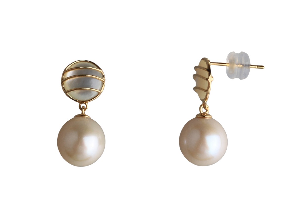 18K YELLOW GOLD EARRINGS WITH MOTHER OF PEARL AND 9-9.5MM ROUND FRESHWATER PEARL