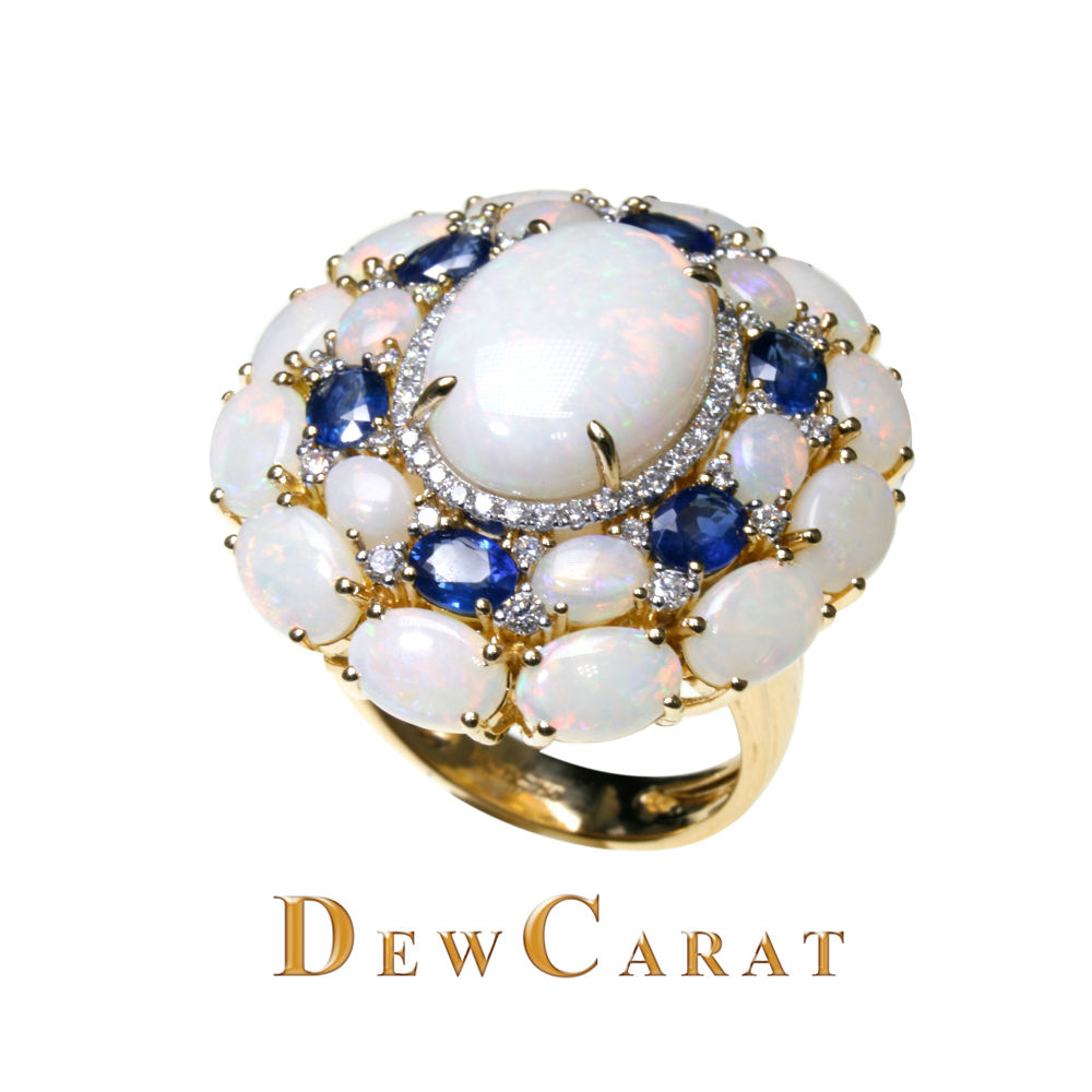 18K Yellow Gold Opal Blue Sapphire Diamond Ring