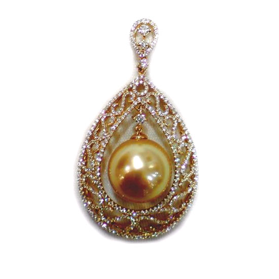 Pictured is a teardrop-shape pendant crafted with exquisite 18K yellow gold. The pendant centers a golden pearl which is full and round. The pearl is embraced in an openwork cradle studded with white diamonds.