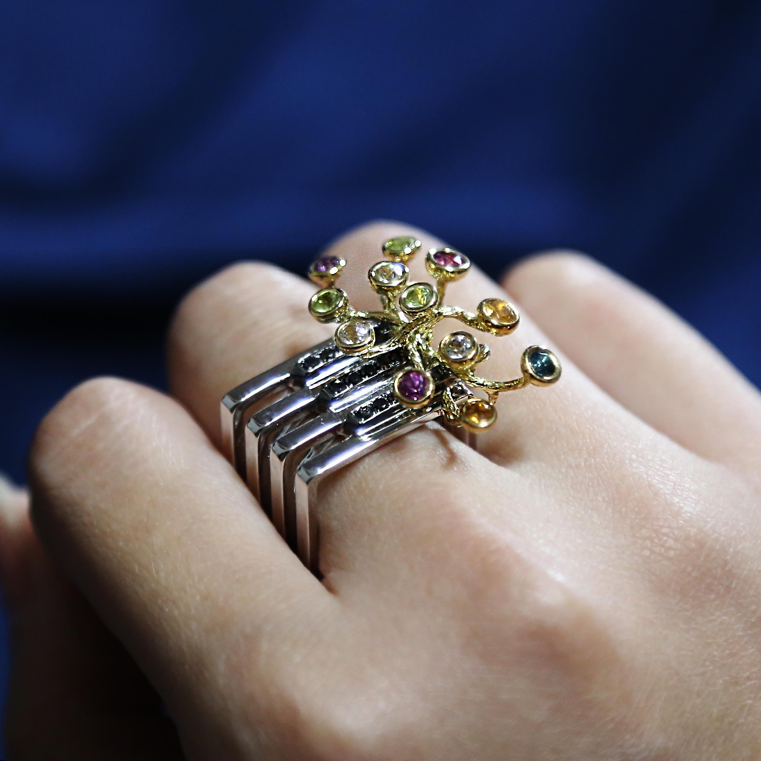 Wonderful & Happy Melody: 18K White Gold Natural Colorful Tourmaline Natural Black Diamond Ring