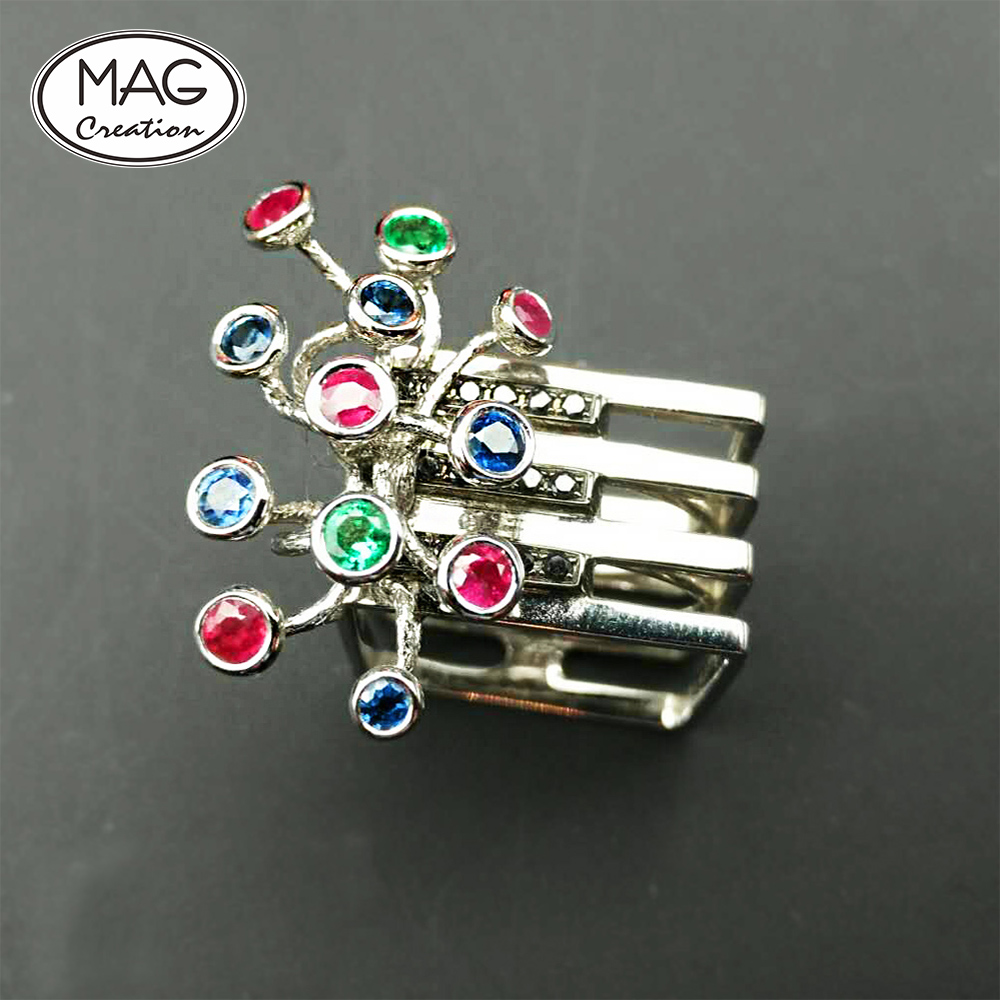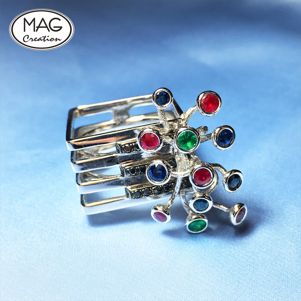 Wonderful & Happy Melody: 18K White Gold Natural Ruby Natural Sapphire Natural Emerald Natural Black Diamond Ring