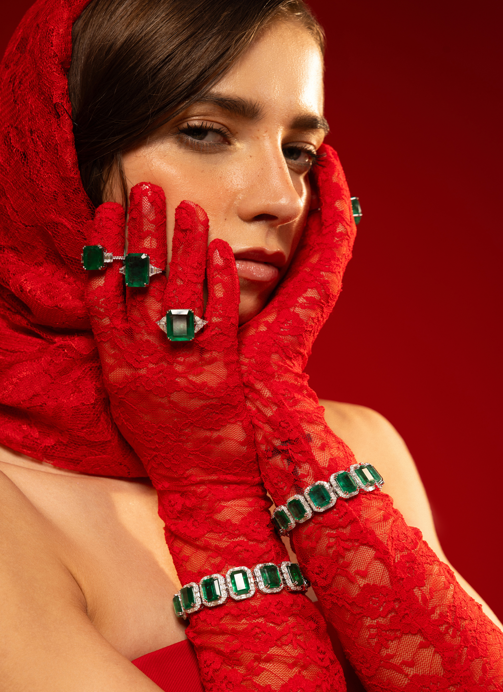 18KT GOLD RING & BRACELETS STUDDED WITH NATURAL DIAMONDS AND NATURAL ZAMBIAN EMERALDS