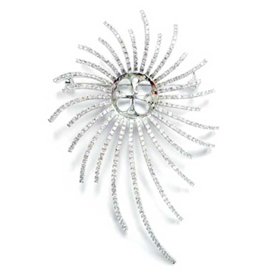 This pendant brooch mounting is decorated with shimmery diamonds all over. The whole piece is crafted with great attention to details. The light-colored design makes it match many kinds of pearl perfectly.
