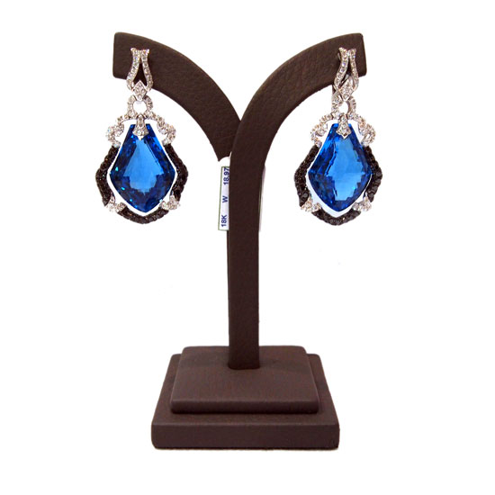 Showcased here is a piece of splendid jewelry crafted with precious blue topaz and diamond. The beautifully cut blue topaz exhibits captivating shine and sparkle. White diamonds and black diamonds are added for an extra touch of glamour.