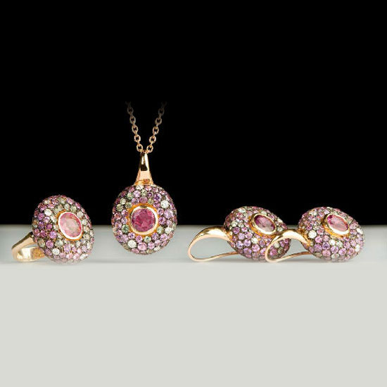 This alluring jewelry collection is composed of a pendant, a pair of earrings and a ring. It is made of 18kt pink gold and is highlighted with fancy diamonds and sapphires. The elegant rounded design artfully combines with fascinating pink, white, green and golden colors.