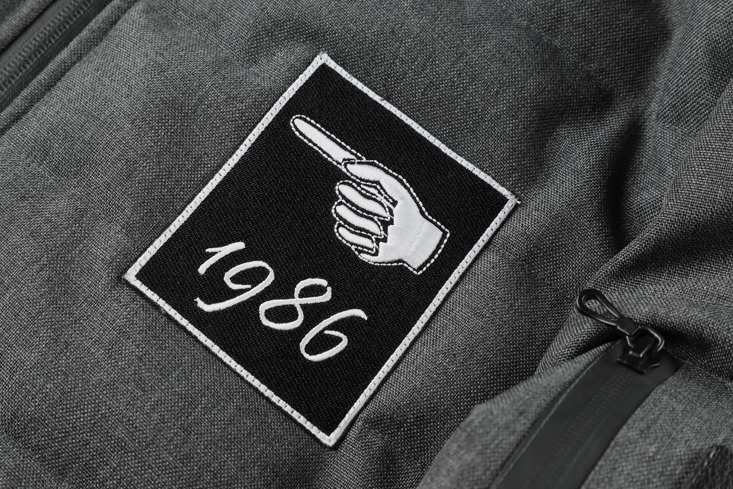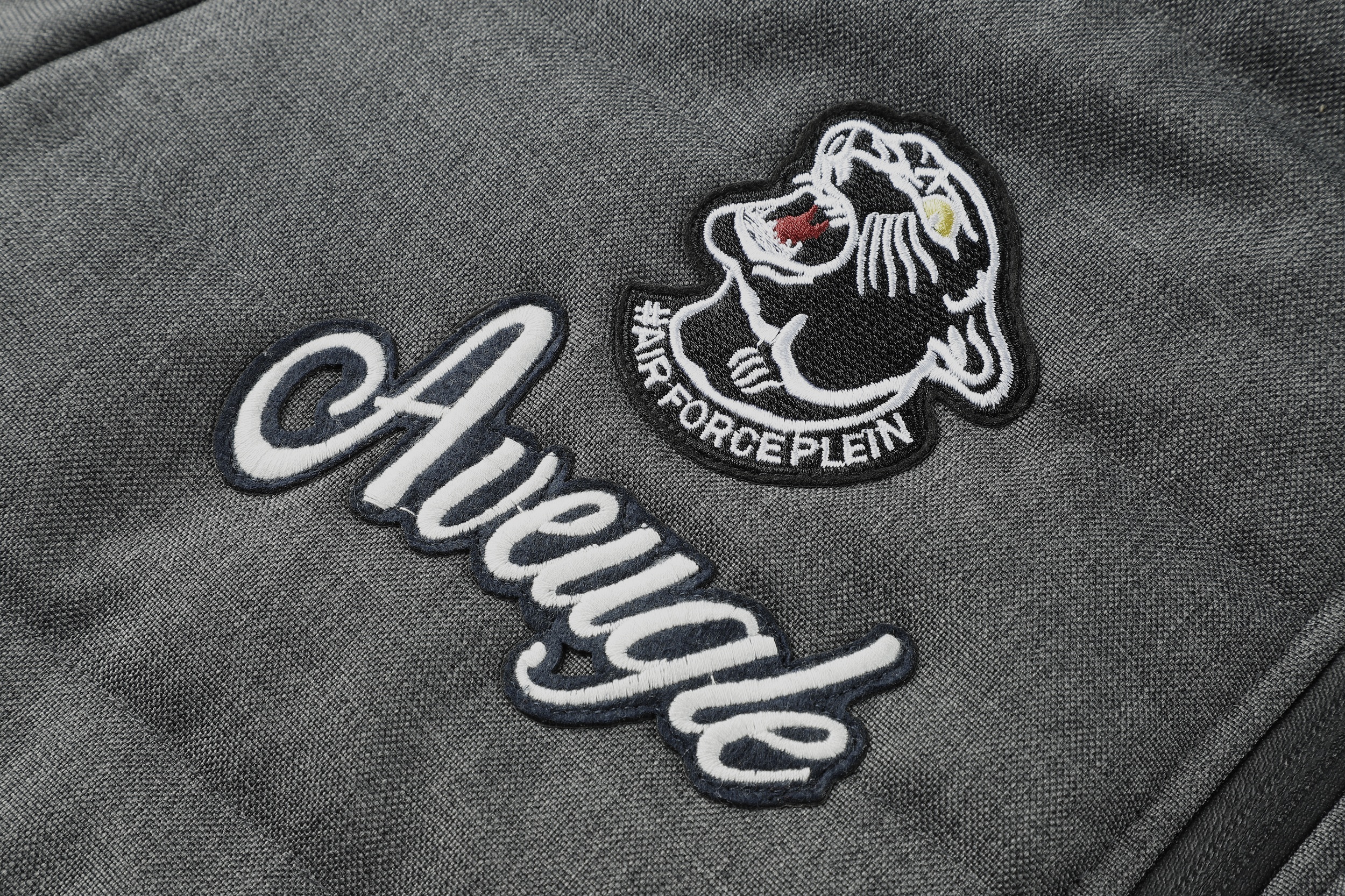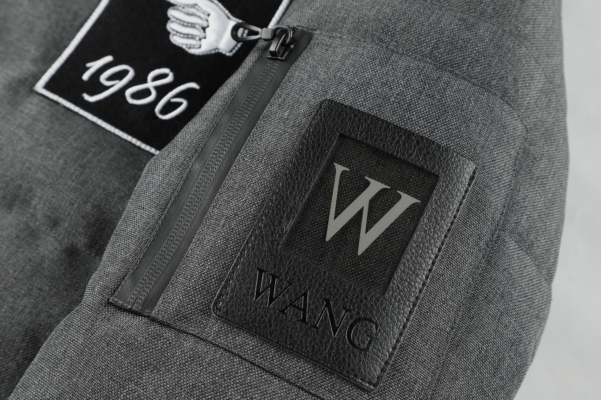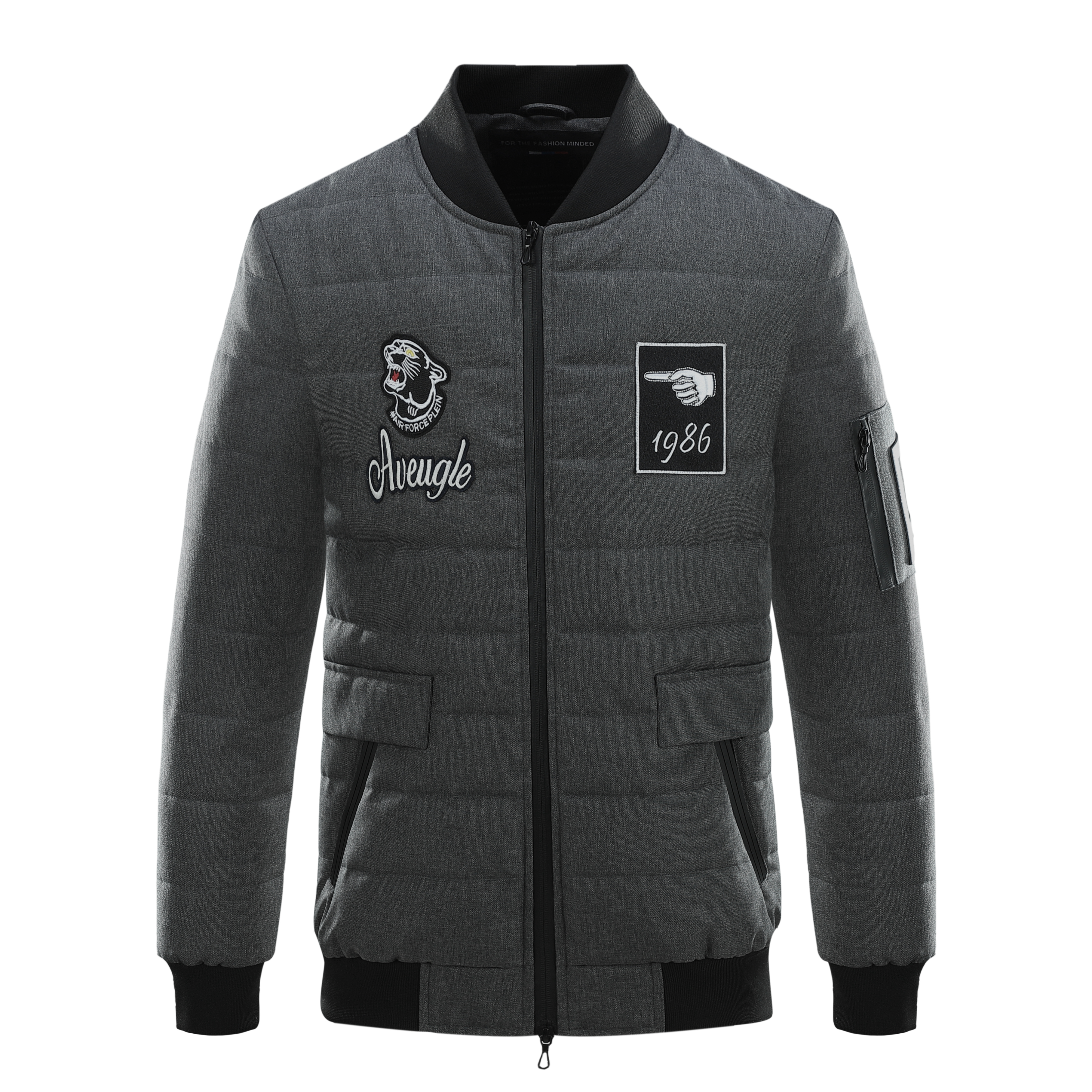This is a gray jacket with a simple and stylish design. The front of the jacket features two prominent badges, one on the left with the word "Newage" and an image, and another square badge on the right that reads "1986" and "Newage". The collar and cuffs of the jacket are black, adding contrast. The hem and cuffs have elastic designs, making it suitable for various body types. Overall, this jacket combines retro elements with modern fashion trends, making it perfect for casual wear.
