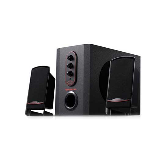 This is a 2.1-CH speaker system with a professional and super elegant design. The subwoofer comes with an MDF wooden cabinet with a matt finish. The red details highlight this system for added style.