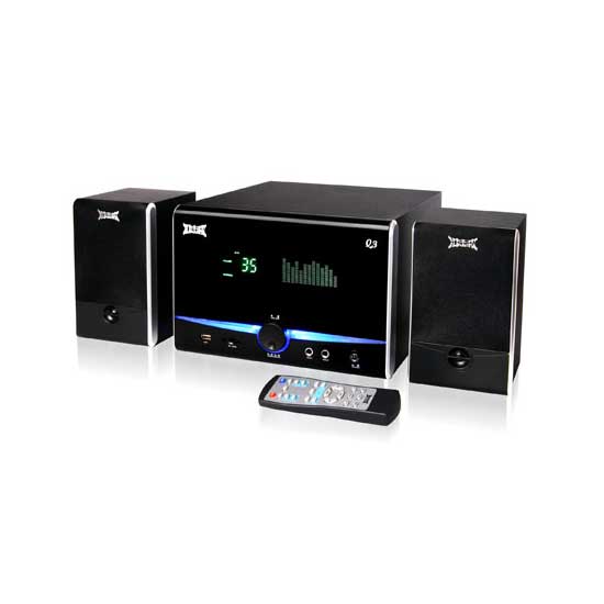 This multimedia speaker system comes with a one-touch design with a multi-purpose control knob. The VFD dynamic display screen is attractive and bright even in complete darkness. This item includes a built-in FM radio, double karaoke jacks, a USB port, a SD card slot, etc.
