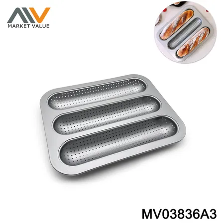 | MV03836A3 | 3 SLOTS BAGUETTE PAN,ENAMEL COATING,WHEEL CARD+PP BAG | 32X25.5X3CM,T:0.6MM,548G,carbon steel | $3.22 |