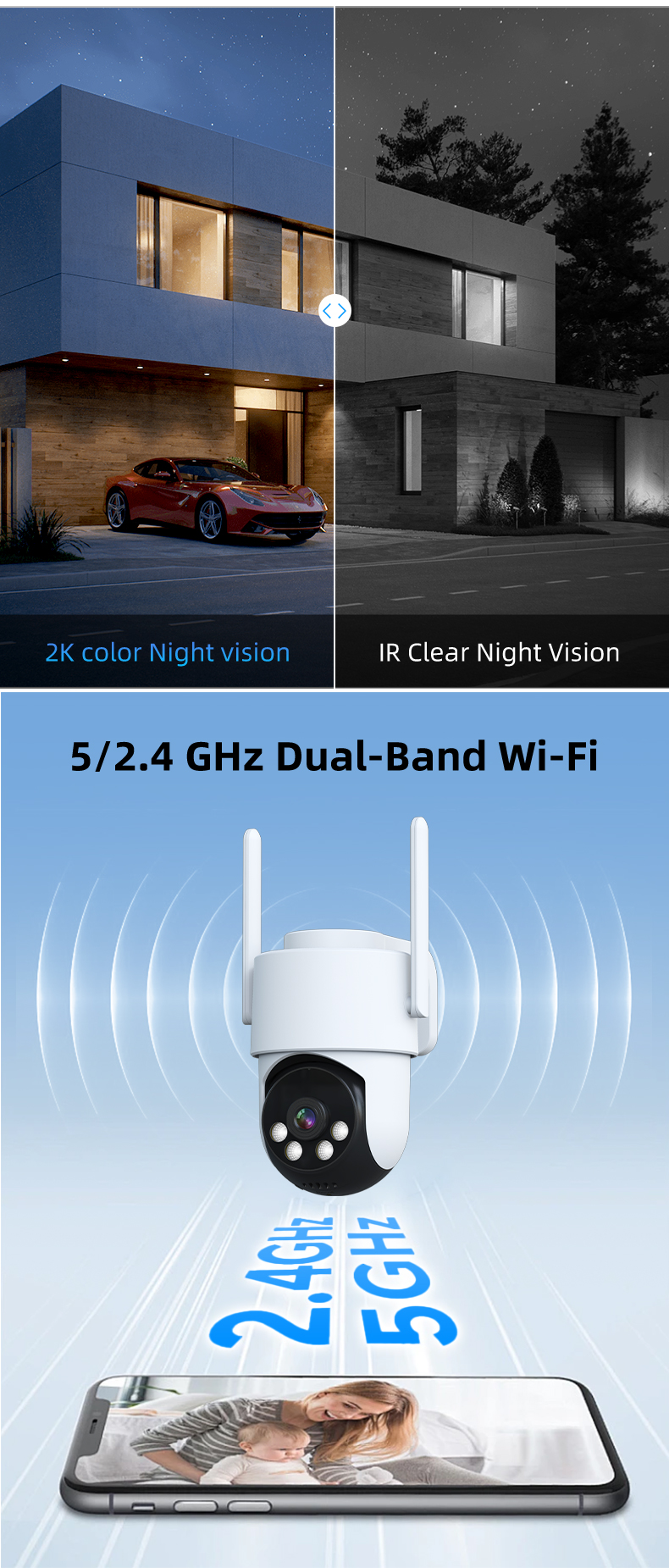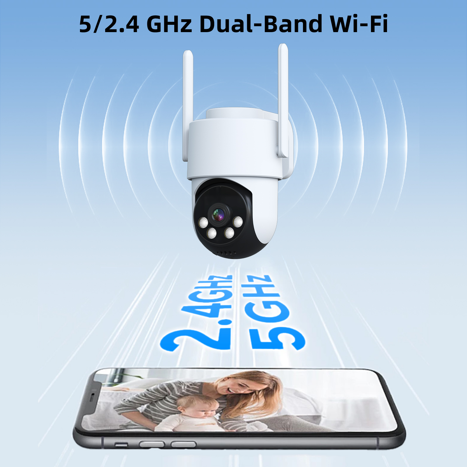The camera supports dual-band Wi-Fi (5 GHz and 2.4 GHz), ensuring stable and reliable connectivity. This feature allows for smooth streaming and remote access from anywhere.