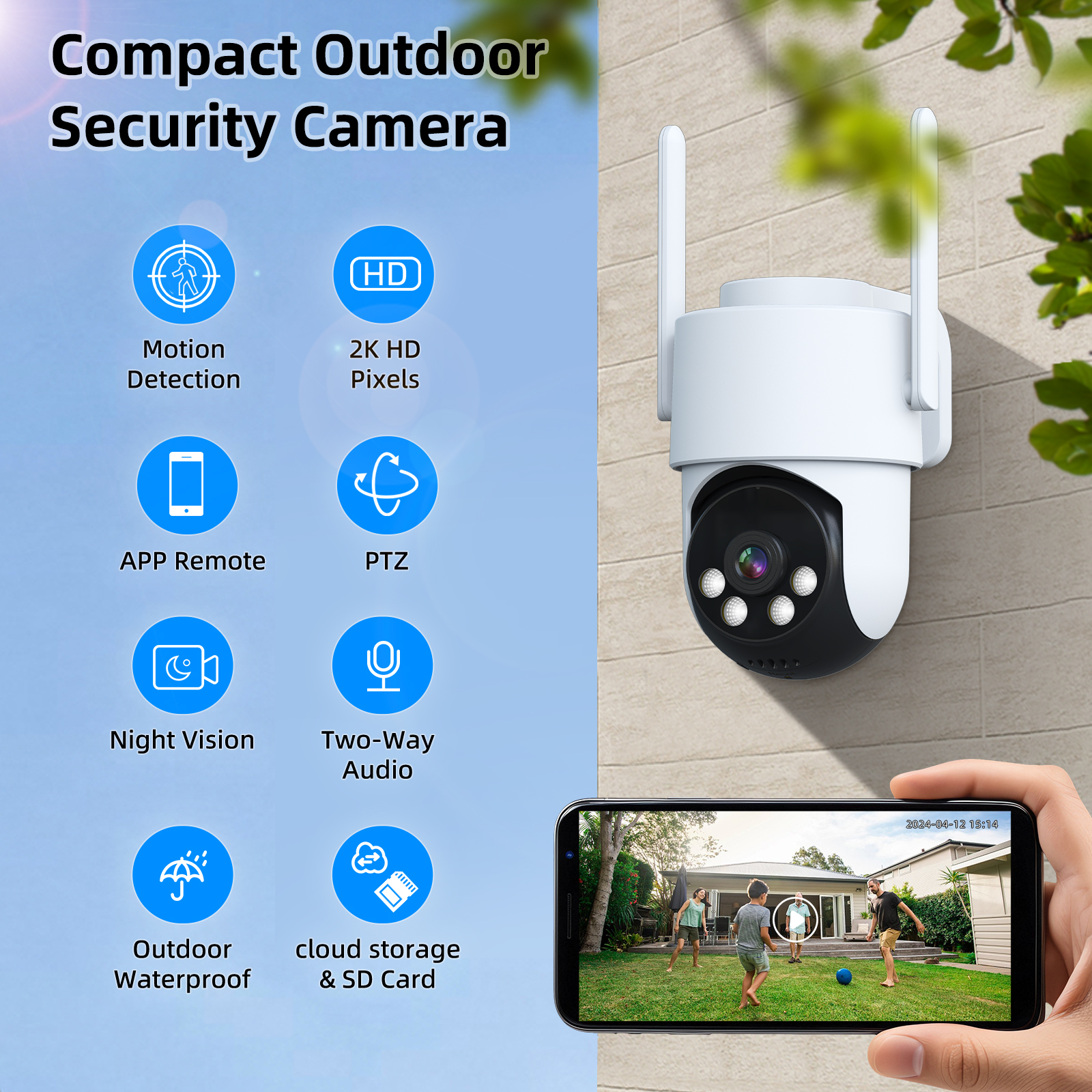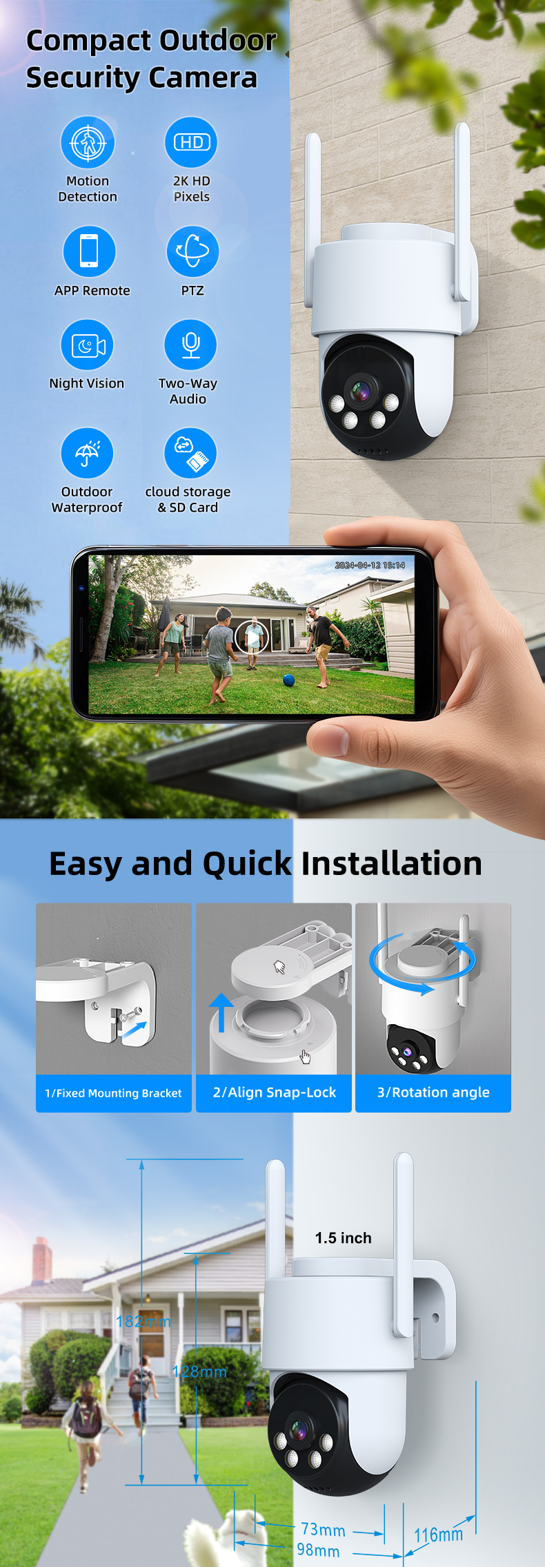This compact outdoor security camera is designed for easy and quick installation. It features motion detection, night vision, two-way audio, and cloud storage capabilities.