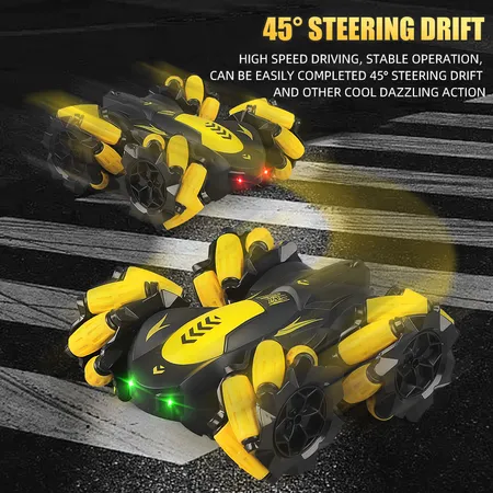 2.4G DOUBLE SIDE DRIFT STUNT CAR 1- Play time: 15-20 mins,2- Charging Time: about 120 mins,3- Control distance: 15-20M,4- Car battery: 3.7V 500mAh rechargeble battery (included),5- Remotor Battery: 1.5V AAx2 battery (not included),6- Accessory: USB charger x 1,7- Product size: 15x15 x 7cm,8-Function:2.4G,light,4WD lateral walking,4WD drift,go forward/back,turn left/right,double side filp, 360 spins,demo