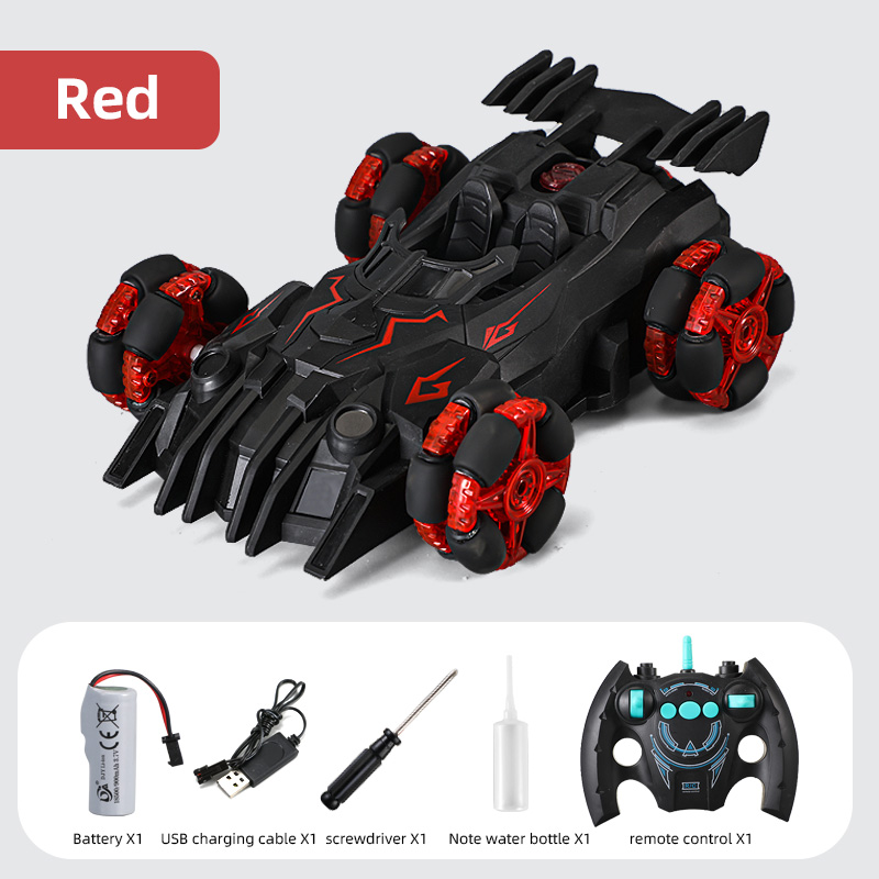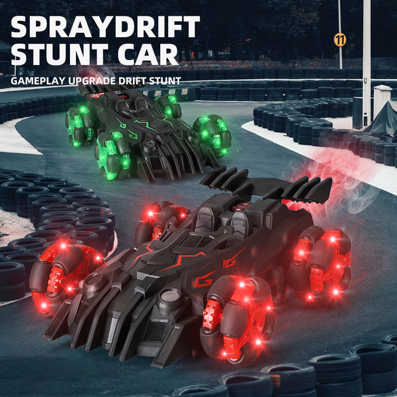 2.4G DRIFT SPRAY FIGHTING CAR 1- Play time: 15-20 mins,2- Charging Time: about 140 mins,3- Control distance: 15-20M,4- Car battery: 3.7V 900mAh rechargeble battery (included),5- Remotor Battery: 1.5V AAx2 battery (not included),6- Accessory: USB charger x 1,7- Product size: 28x19 x 9cm,8-Function:2.4G,light,4WD lateral walking,4WD drift,go forward/back,turn left/right,360 spins,demo,Light spray